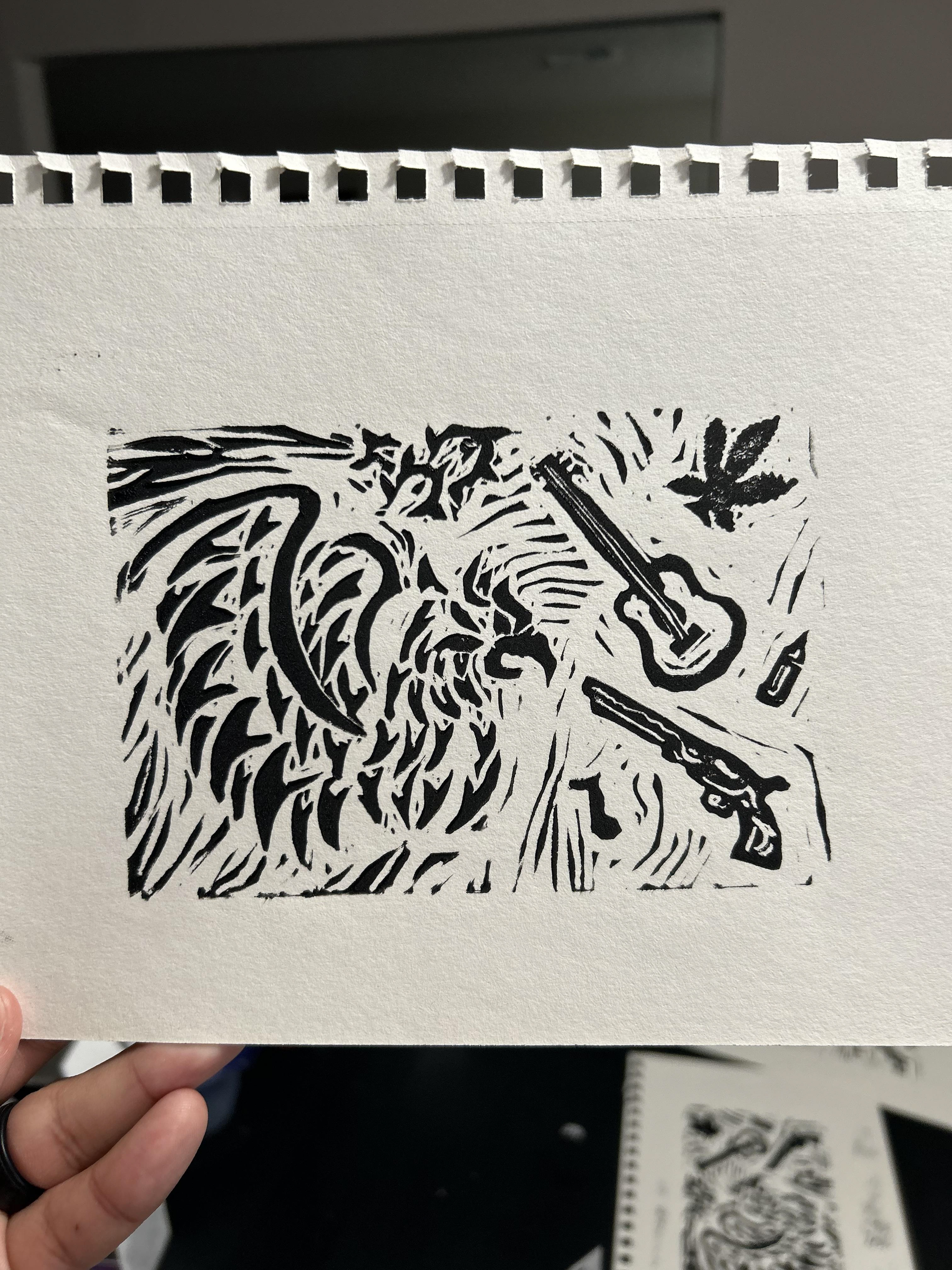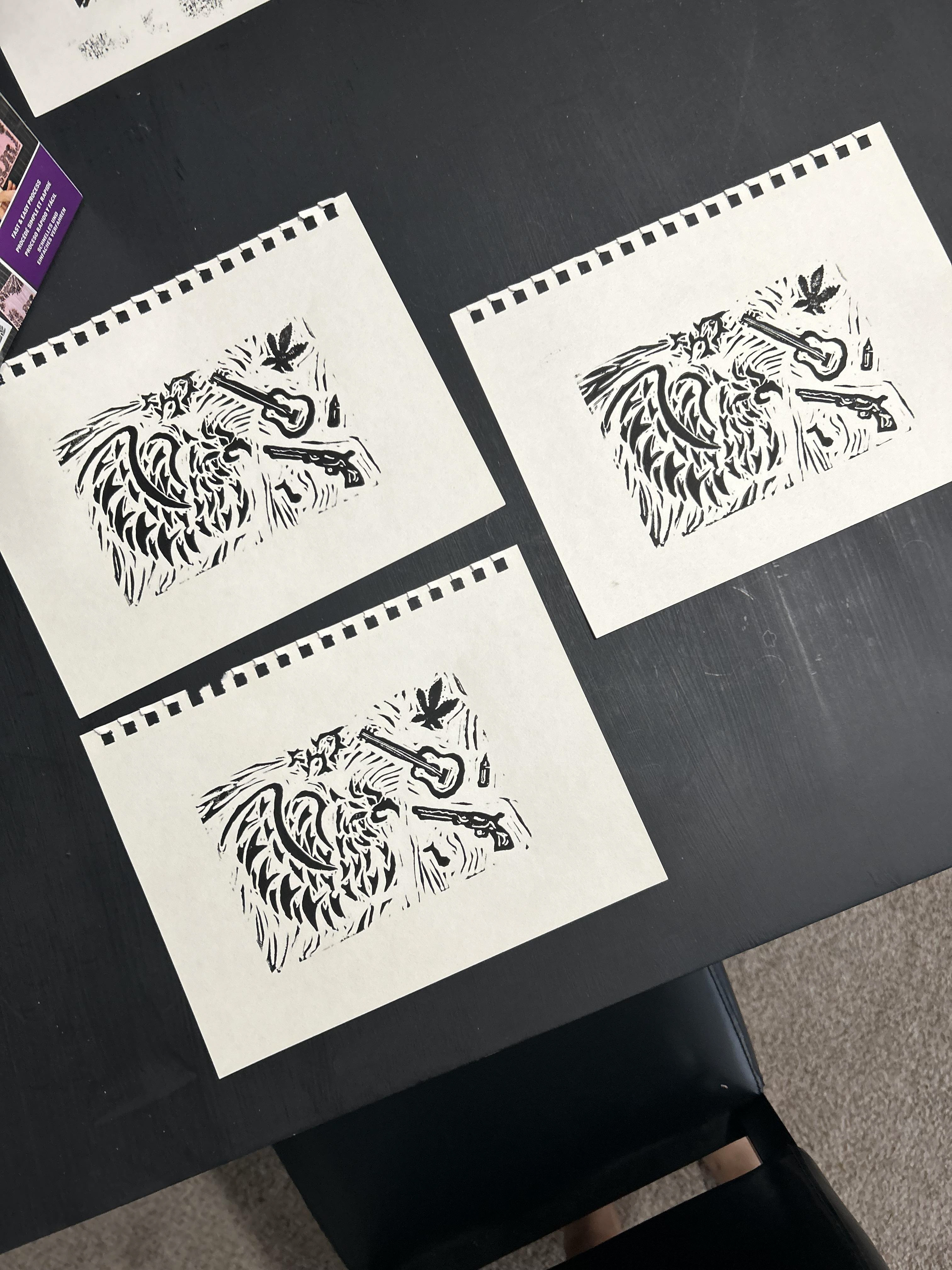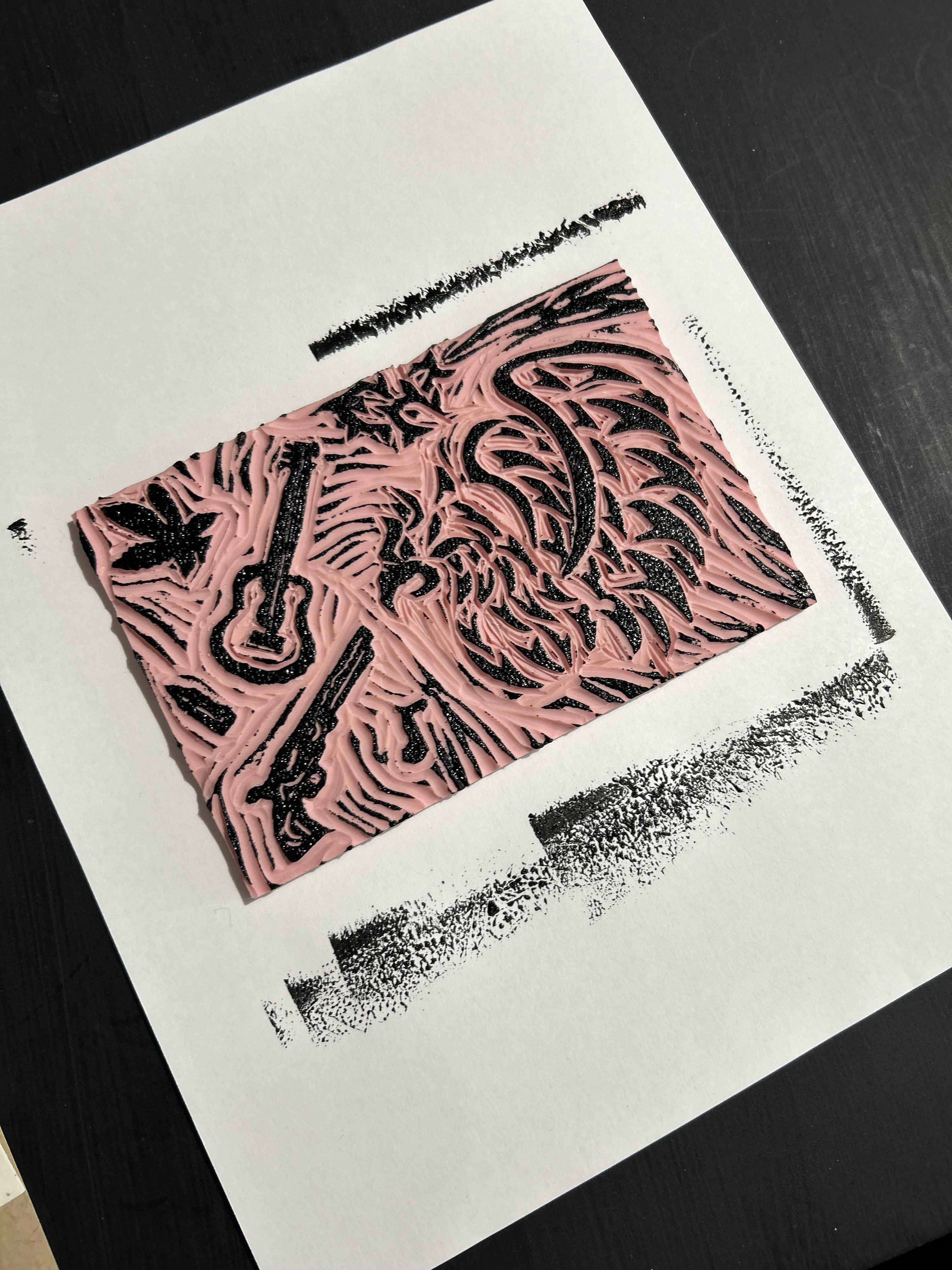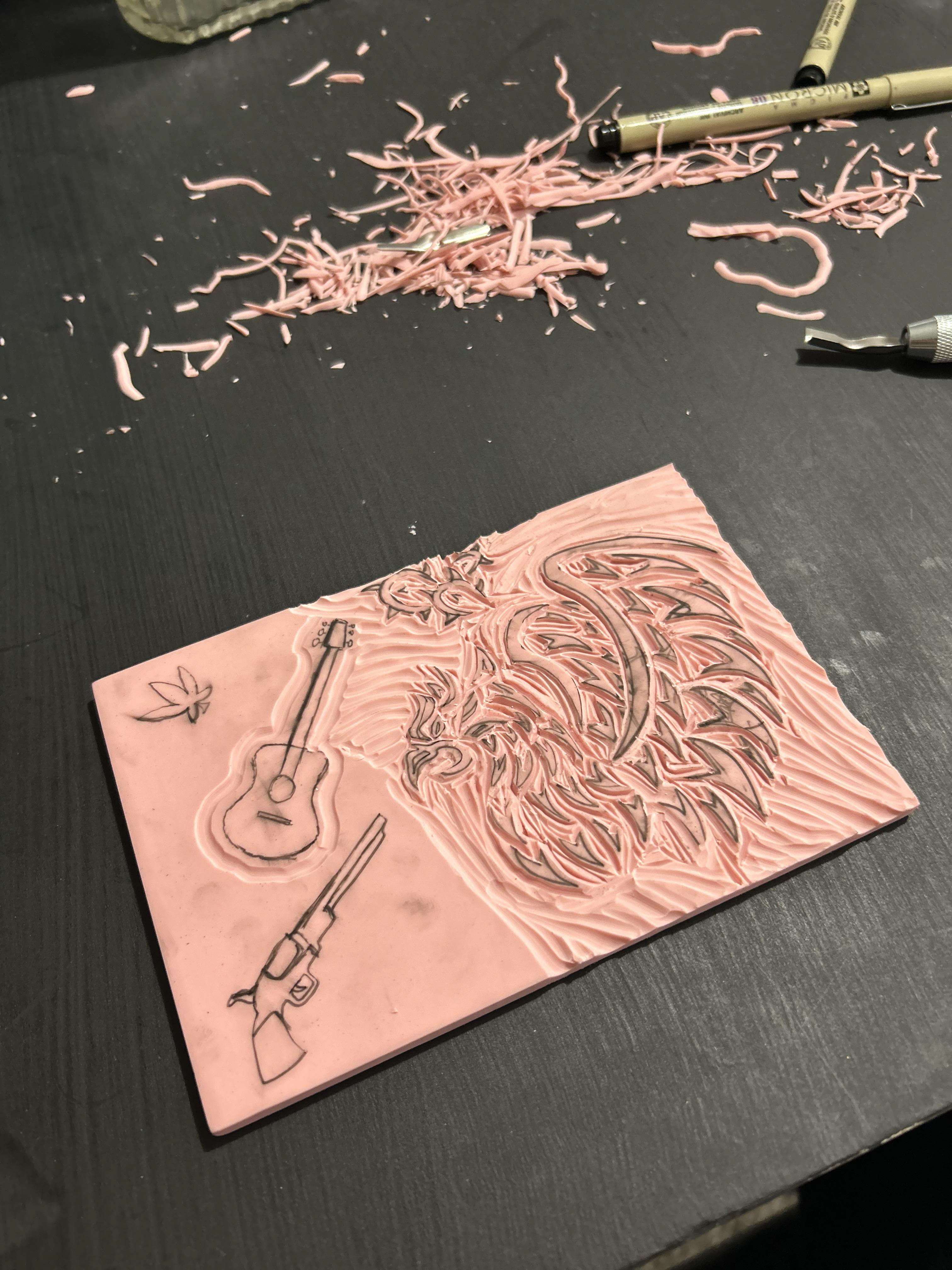 A design was carved from a block and then printed to get the elements on the album cover as well as other areas. The print was scanned in and vectorized.